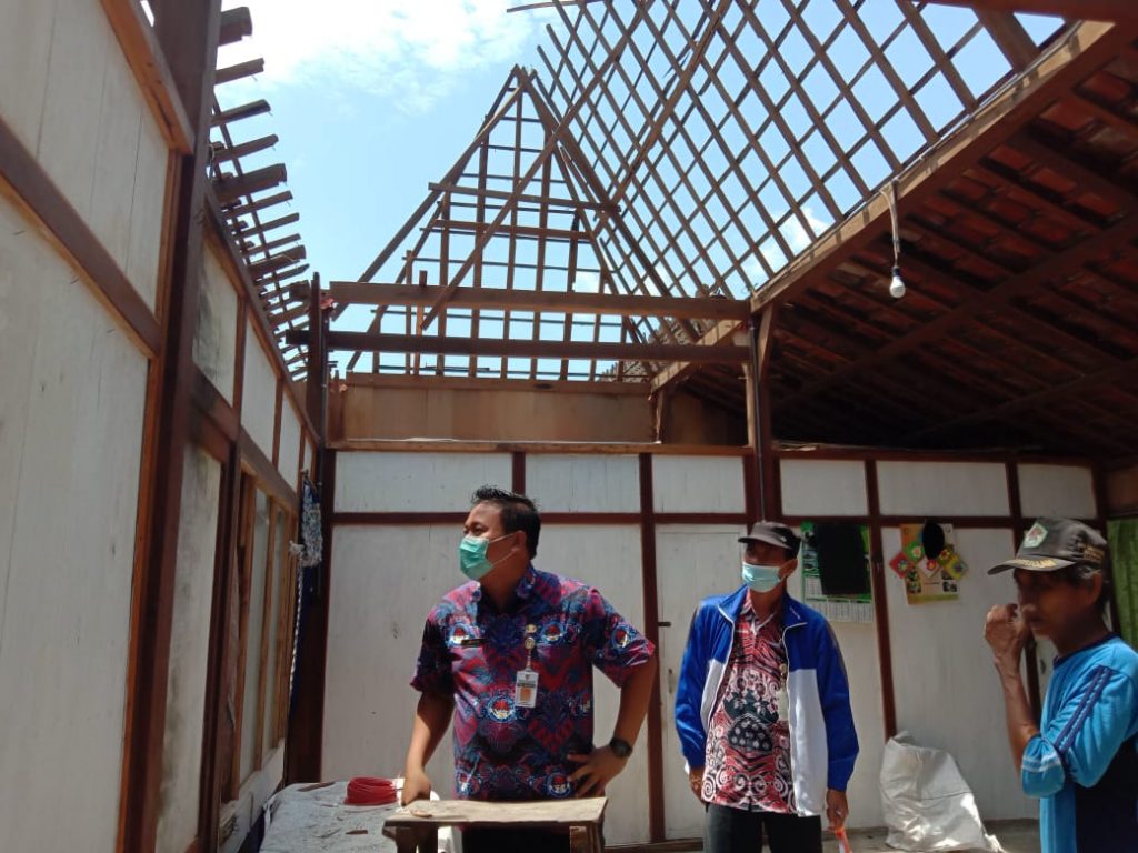 Petugas tanggap bencana Dinperkim yaitu Agus Kristiani dan Rahma amaliya dengan di damping salah satu dari perangkat desa melakukan cek lokasi dan kerusakan yang terjadi akibat dari sambaran petir pada malam tersebut. Curah hujan yang tinggi di sertai angin kencang dan petir mengakibatkan rumah Sukarmin ini mengalami kerusakan pada atap (genteng).