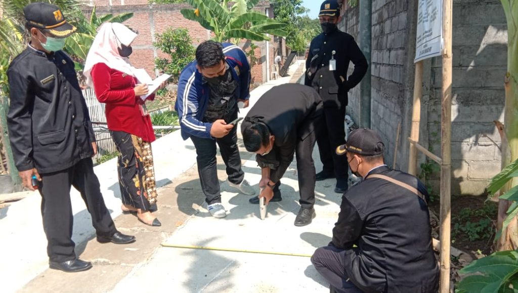 Dinperkim Kab. Demak – Selasa, 28 September 2021 Tim Pelaksana Bidang Perumahan, Suparno, SE , Gus Maelan, ST , Suci Nur Hayati, ST dan Andika Indra Setiawan di dampingi perangkat desa setempat melakukan pemeriksaan 100% pekerjaan Betonisasi jalan lingkungan Perum Arum Kuncoro Desa Wonosalam Kecamatan Wonosalam.